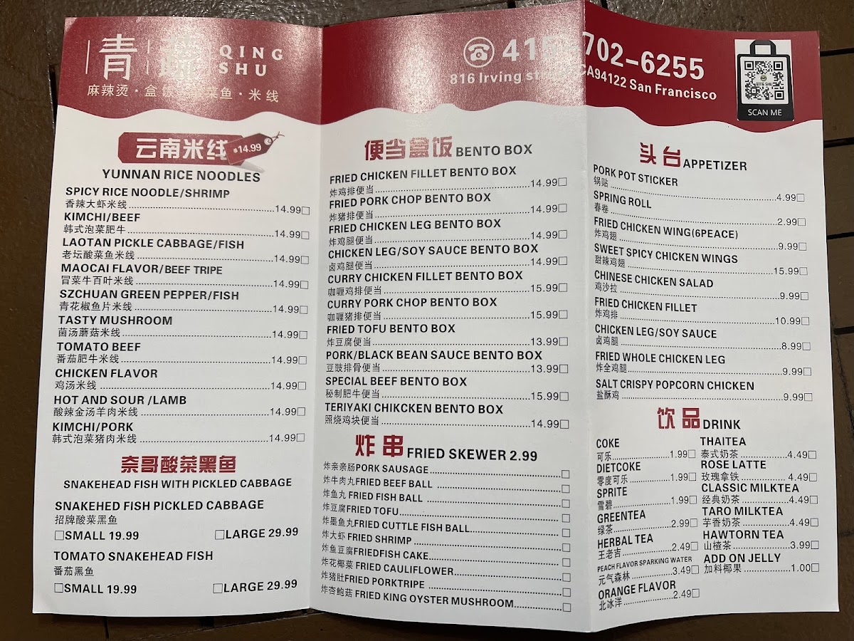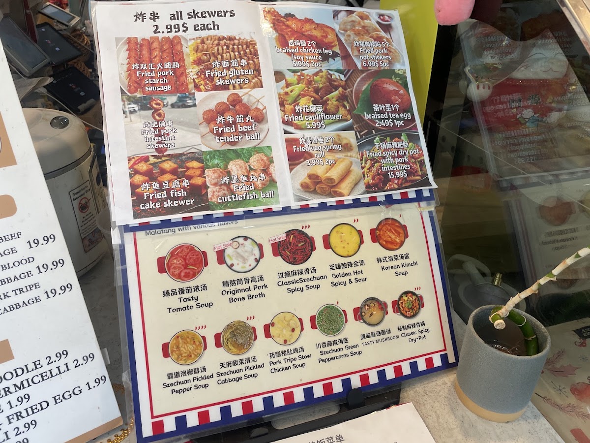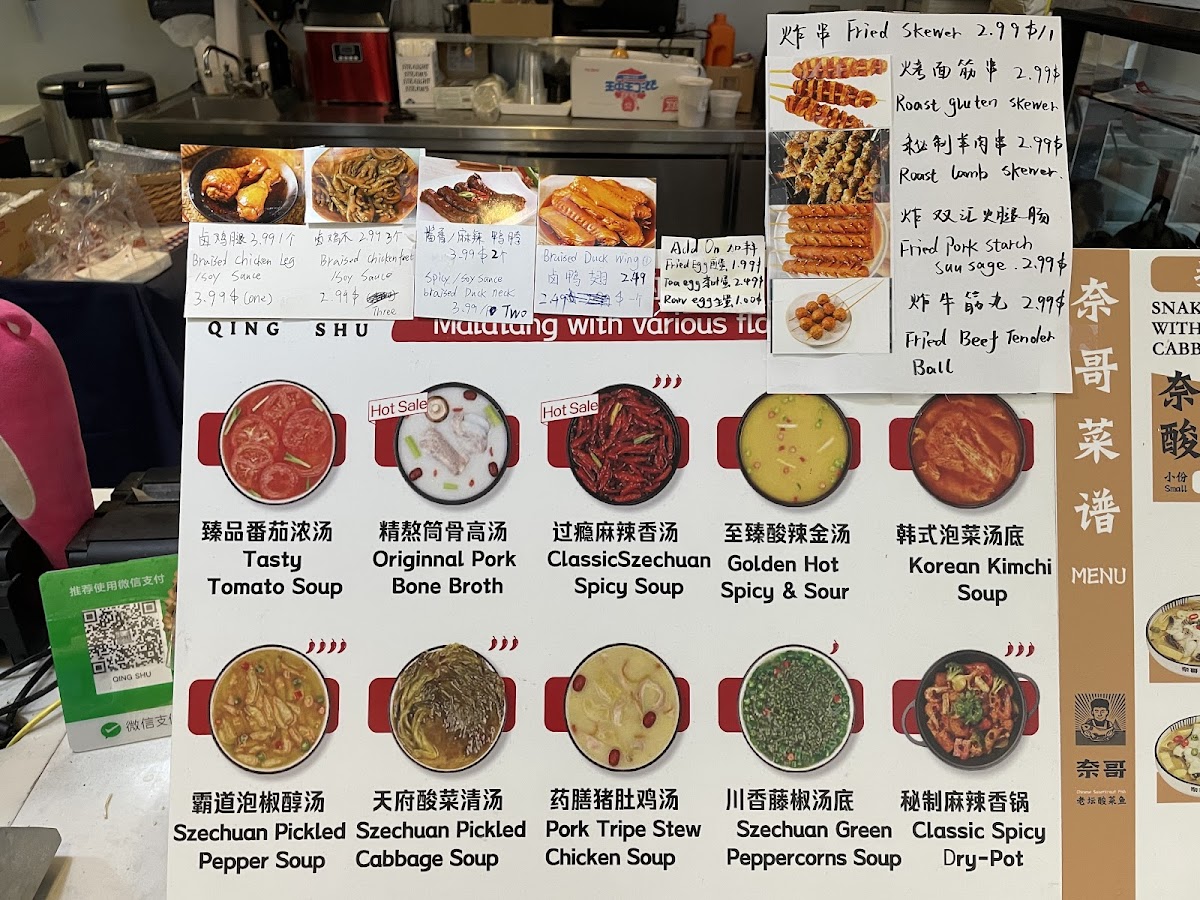 From a reviewer’s perspective, the menu at Qingshu Malatang & Nai Brother Fish offers an impressively wide range of comfort dishes and customizable options, making it easy to find something satisfying at different price points. The fried skewer section includes favorites like Fried Cuttle Fish Ball, Fried Cauliflower (Box), Grill Pork Ribs Skewers, and Fried Pork Starch Sausage, which are great as shareable snacks. For more filling meals, the curry rice plates such as Curry Fired Pork Chop Over Rice, Curry Chicken Leg Meat Over Rice, Curry Mix Veg Over Rice, Curry Fried Chicken Over Rice, and Curry Prawn Over Rice provide hearty options. The Yunnan rice noodle soups, including Golden Hot Spicy Pork Intestines And Tripe Rice Noodle, Tasty Mushroom Flavor Rice Noodle, Tomato With Sliced Beef Rice Noodle, Hot Sour With Lamb Rice Noodle, and Chicken Flavor Rice Noodle, stand out as flavorful signature items. Dessert choices like Mini Sesame Ball (6pc) and Fried Taro Sweet Potato Balls (6pc) offer a sweet finish. The customizable Malatang options such as Golden Hot And Sour Soup, New Chengdu Maocai Flavor, Original Pork Bone Soup Malatang Blind Box, and New Coconut Chicken Flavor are a highlight, especially when paired with combos like Original Pork Bone Seafood Combo, Fantastic Vegetarian Combo, or Classic Combo. Bento options such as Pork Ribs W/ Black Bean Sauce Bento Box, Curry Chicken Fillet Bento Box, Fried Pork Chop Bento Box, Teriyaki Chicken Bento Box, and Special Chicken Leg Rice are convenient and reasonably priced meals. With additional offerings like Braised Chicken Feet (3 pcs), Spicy Duck Neck (3 pcs), Classic Sauerkraut Snakehead Fillet Combo, and stir-fried noodles like Chicken Chow Mein and Beef Stir Fry Udon, the menu feels both diverse and satisfying, making it a great spot for anyone craving malatang, rice dishes, or hearty noodle soups at affordable prices.