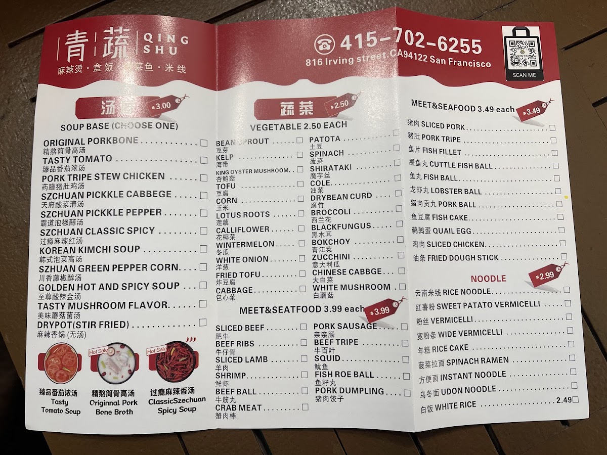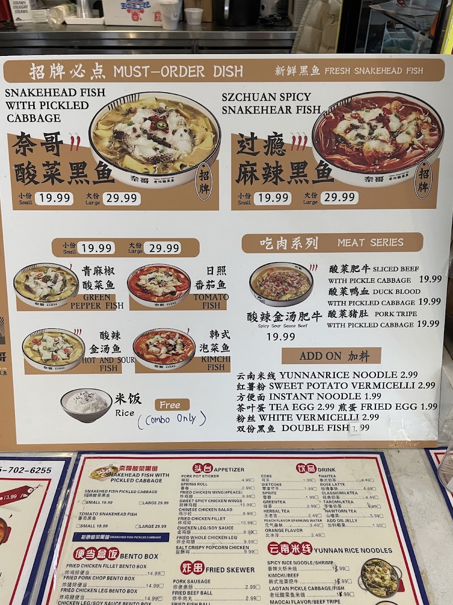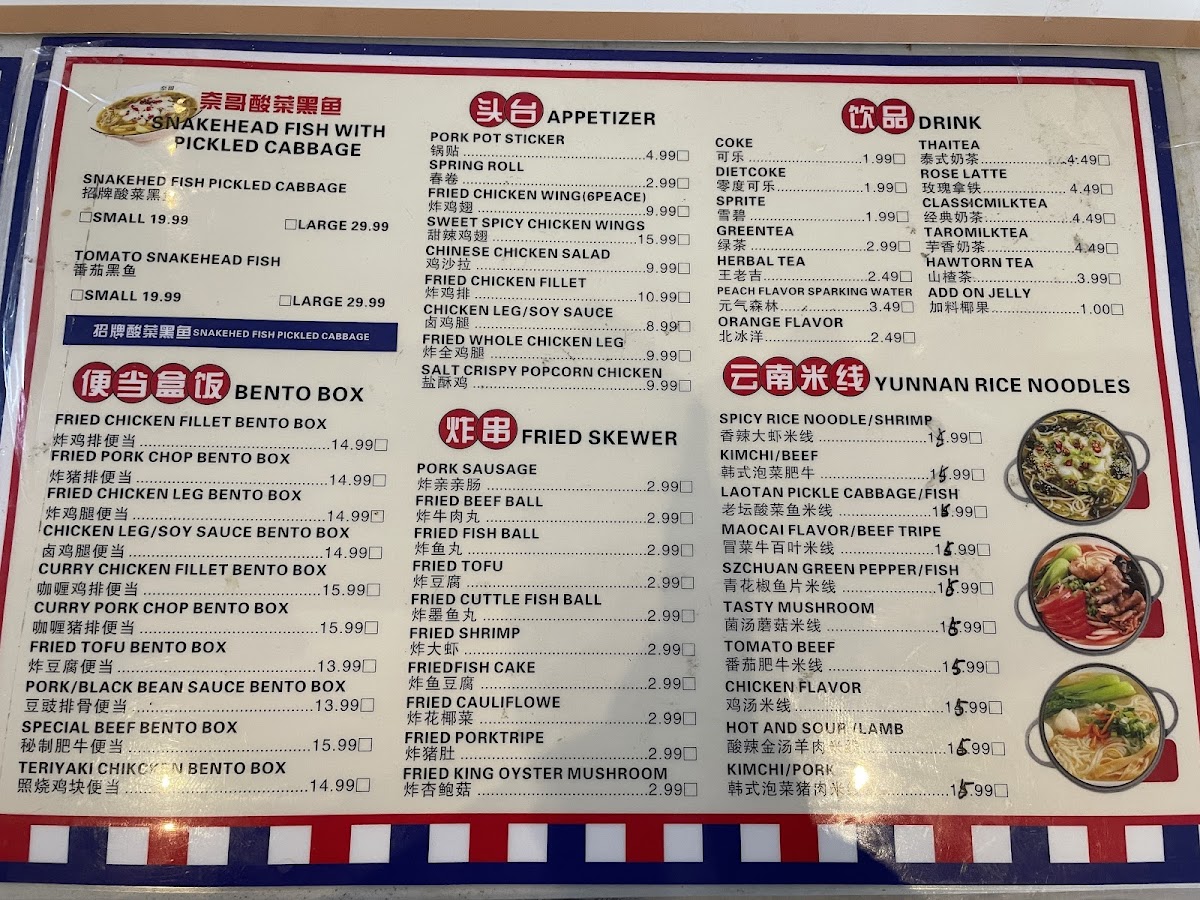 From a reviewer’s perspective, the menu at Qingshu Malatang & Nai Brother Fish offers an impressively wide range of comfort dishes and customizable options, making it easy to find something satisfying at different price points. The fried skewer section includes favorites like Fried Cuttle Fish Ball, Fried Cauliflower (Box), Grill Pork Ribs Skewers, and Fried Pork Starch Sausage, which are great as shareable snacks. For more filling meals, the curry rice plates such as Curry Fired Pork Chop Over Rice, Curry Chicken Leg Meat Over Rice, Curry Mix Veg Over Rice, Curry Fried Chicken Over Rice, and Curry Prawn Over Rice provide hearty options. The Yunnan rice noodle soups, including Golden Hot Spicy Pork Intestines And Tripe Rice Noodle, Tasty Mushroom Flavor Rice Noodle, Tomato With Sliced Beef Rice Noodle, Hot Sour With Lamb Rice Noodle, and Chicken Flavor Rice Noodle, stand out as flavorful signature items. Dessert choices like Mini Sesame Ball (6pc) and Fried Taro Sweet Potato Balls (6pc) offer a sweet finish. The customizable Malatang options such as Golden Hot And Sour Soup, New Chengdu Maocai Flavor, Original Pork Bone Soup Malatang Blind Box, and New Coconut Chicken Flavor are a highlight, especially when paired with combos like Original Pork Bone Seafood Combo, Fantastic Vegetarian Combo, or Classic Combo. Bento options such as Pork Ribs W/ Black Bean Sauce Bento Box, Curry Chicken Fillet Bento Box, Fried Pork Chop Bento Box, Teriyaki Chicken Bento Box, and Special Chicken Leg Rice are convenient and reasonably priced meals. With additional offerings like Braised Chicken Feet (3 pcs), Spicy Duck Neck (3 pcs), Classic Sauerkraut Snakehead Fillet Combo, and stir-fried noodles like Chicken Chow Mein and Beef Stir Fry Udon, the menu feels both diverse and satisfying, making it a great spot for anyone craving malatang, rice dishes, or hearty noodle soups at affordable prices.